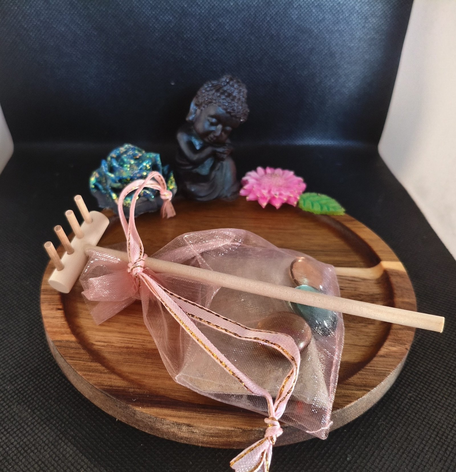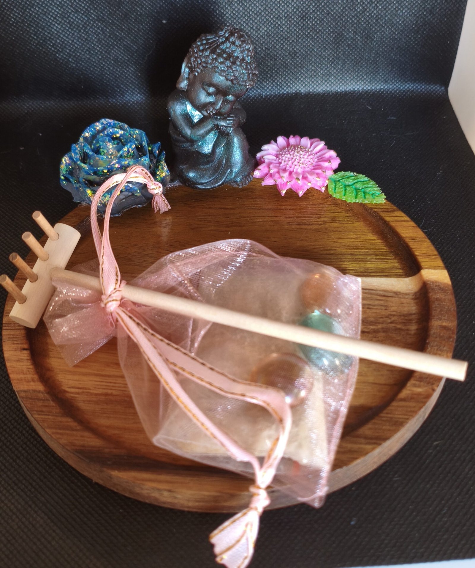 Ce jardin zen, conçu avec minutie, allie la beauté naturelle du bois à l’élégance sobre de la résine. Les éléments soigneusement disposés – le Bouddha, les fleurs et le sable – s’harmonisent pour créer une composition visuellement captivante. L’utilisation de matériaux naturels comme le bois apporte un sentiment d’ancrage et de stabilité, tandis que la résine y ajoute une touche de sophistication moderne. Le râteau miniature inclus vous permet de créer vos propres motifs dans le sable, enrichissant ainsi votre expérience méditative. Découvrez les bienfaits thérapeutiques d’un jardin zen ; bien plus qu’un simple objet de décoration, c’est une véritable expérience.