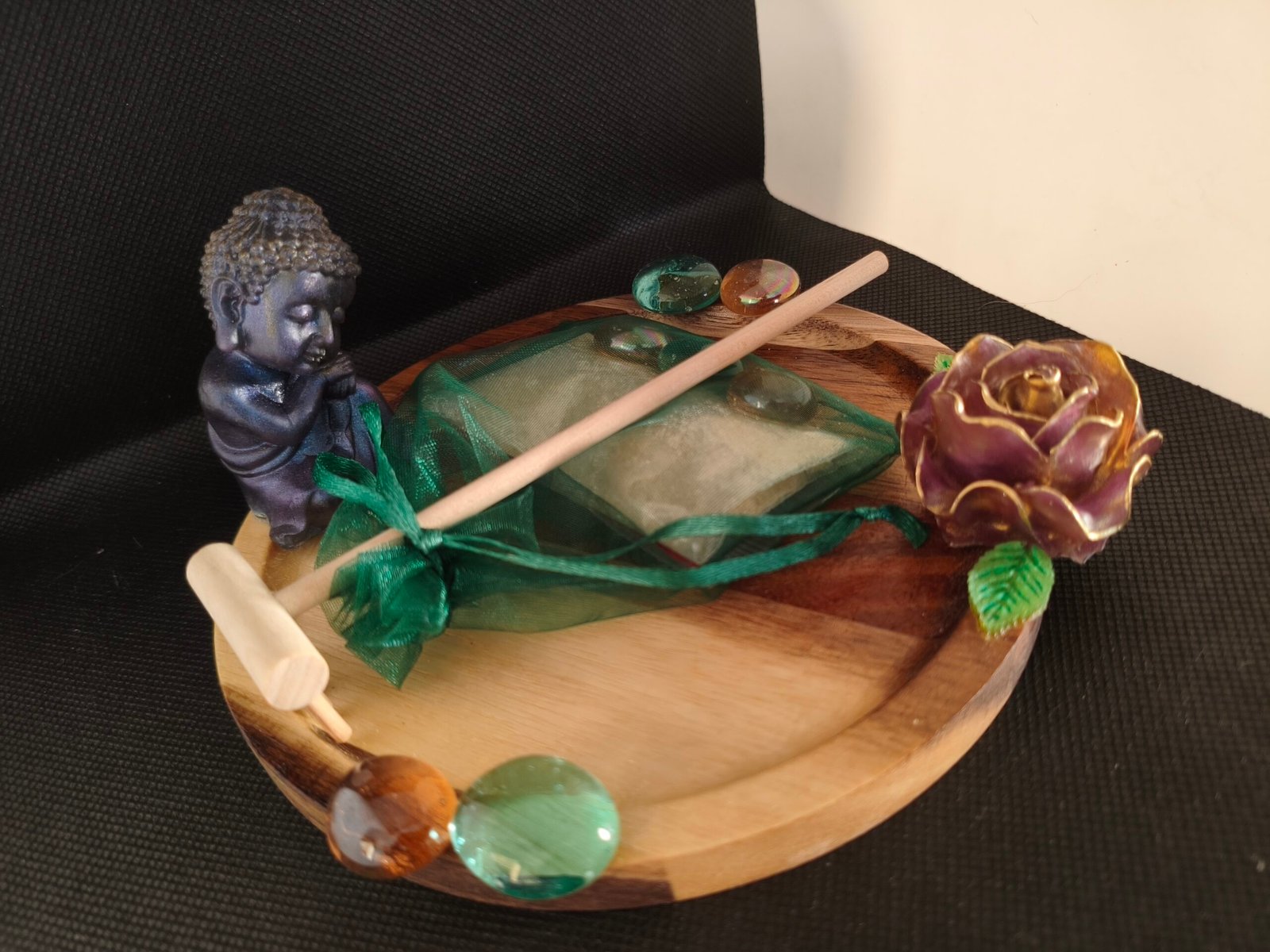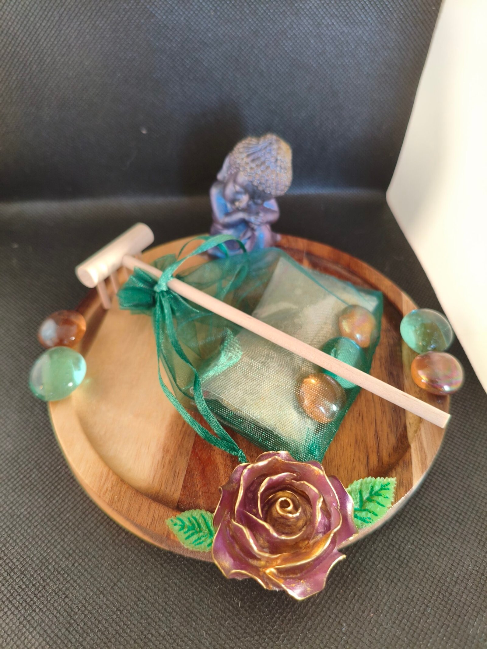 Fabriqué à partir de bois soigneusement sélectionné et recouvert de résine époxy de haute qualité, ce jardin zen garantit à la fois durabilité et esthétique. La résine époxy apporte une touche moderne et brillante tout en protégeant le bois contre l’usure. La sculpture du Bouddha et la rose, méticuleusement travaillées, ajoutent un niveau de sophistication qui ne manquera pas d’impressionner vos invités.